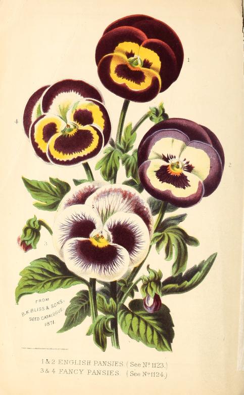 Among the first to adopt it was Benjamin K. Bliss of Springfield, Mass. His 1870 seed catalog contains a vibrant color plate of pansies.